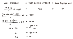 Diketahui A, B, C segaris dan Garis ED // BC. Luas daerah AFBCDE adalah 416 cm². Hitunglah :