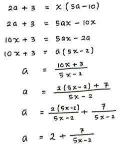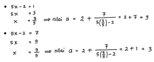 Agar nilai a bernilai bilangan bulat positif, maka penyebut (5x – 2) juga harus bernilai bilangan bulat positif. Maka dari itu, pembagi dari (5x – 2) harus merupakan faktor dari pembilangnya, yaitu 7 (Faktor dari 7 adalah 1 dan 7), Sehingga: