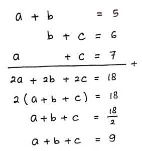 Jika diketahui (a + b) = 5, (b + c) = 6, dan (c + a) = 7, maka nilai a + b + c = …