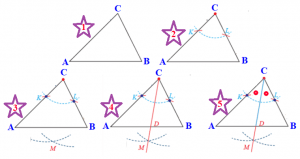 - Buatlah busur dari titik K dan L sebagai titik pusat dengan jari-jari yang sama panjang, sehingga kedua busur tersebut berpotongan di titik M