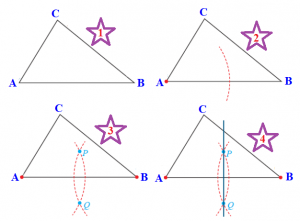 - Hubungkan titik P dengan titik Q, maka garis PQ adalah garis sumbu pada sisi AB